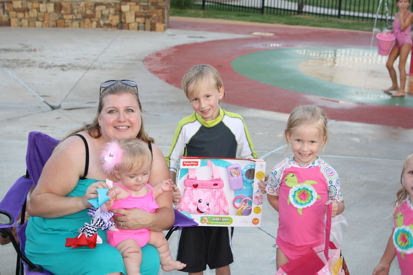 Well, just like Baby K's arrival into this world... nothing went as planned. In the middle of July... in Texas where we never get rain... thunderstorms were popping up everywhere. So the pools were closed. After standing in the parking lot of our pool with our awesome friends, waiting to see if the storms were coming or going away, we made a new plan. We decided to move the party to the SPRAY PARK nearby.